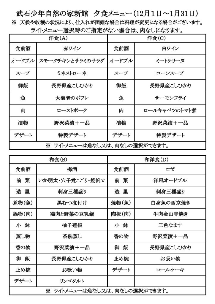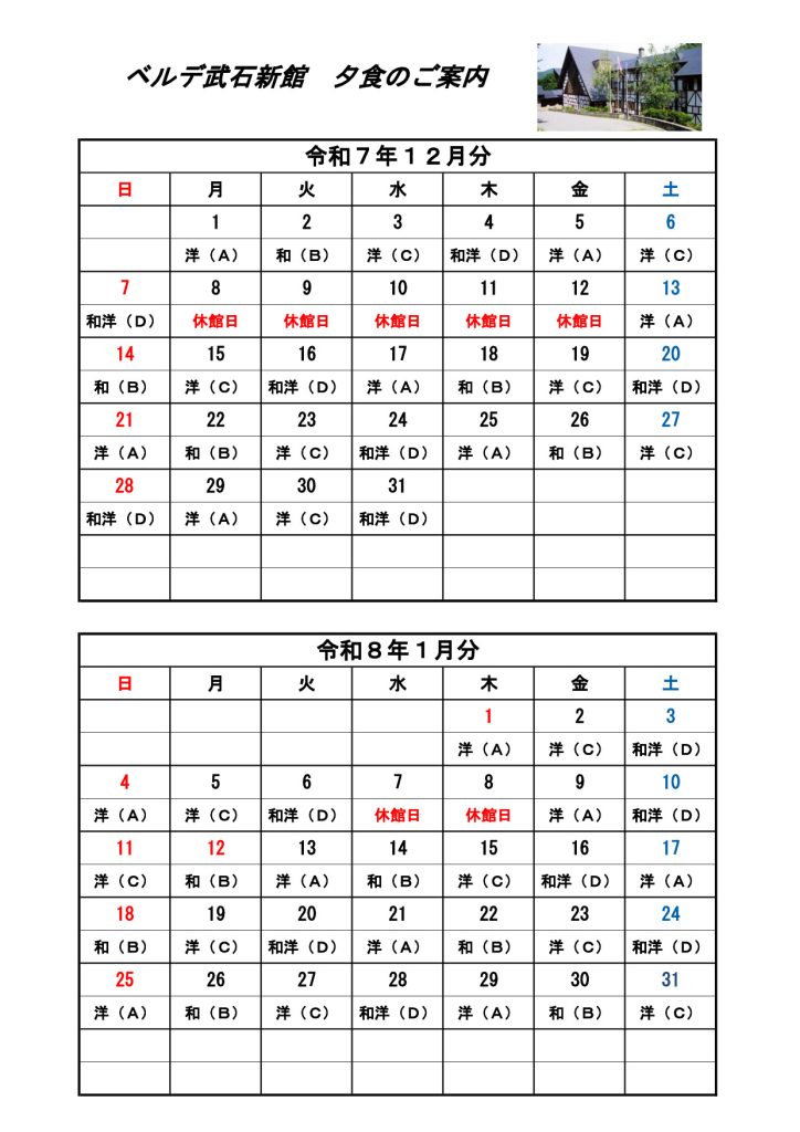 令和7年12月~令和8年1月 夕食カレンダー メニュー